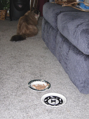 Mom is really watching me like a hawk. She has put a bowl of water and my stinky goodness in the living room so she can watch my intake. I've been eating really well and drinking my water. I went to the litter box less yesterday than the previous day, but it was still messy.